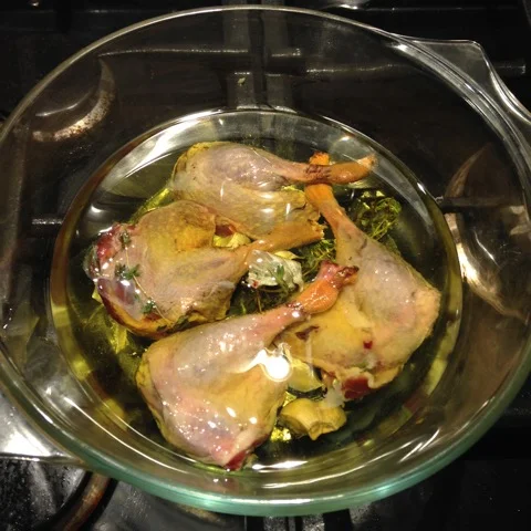Remove the legs from the bird, place them in a snug fitting bowl and add the rest of the cure ingredients excluding the duck fat. Roughly rub the cure all over the legs, cover, and leave in the fridge for between 2 and 4 hours (any longer and the legs will be over salty).