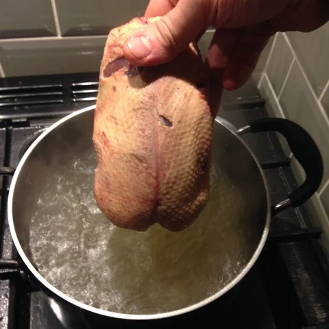 Drop in the Mallard crown and immediately take the pan off the heat. Poach for 4 minutes and then remove onto a rack and allow steam dry for ten minutes.